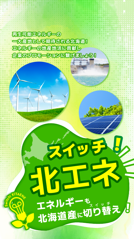 再生可能エネルギーの一大産地として期待される北海道! エネルギーの地産地活に貢献し企業のプロモーションに繋げましょう! スイッチ!北エネ エネルギーも北海道産に切り替え!