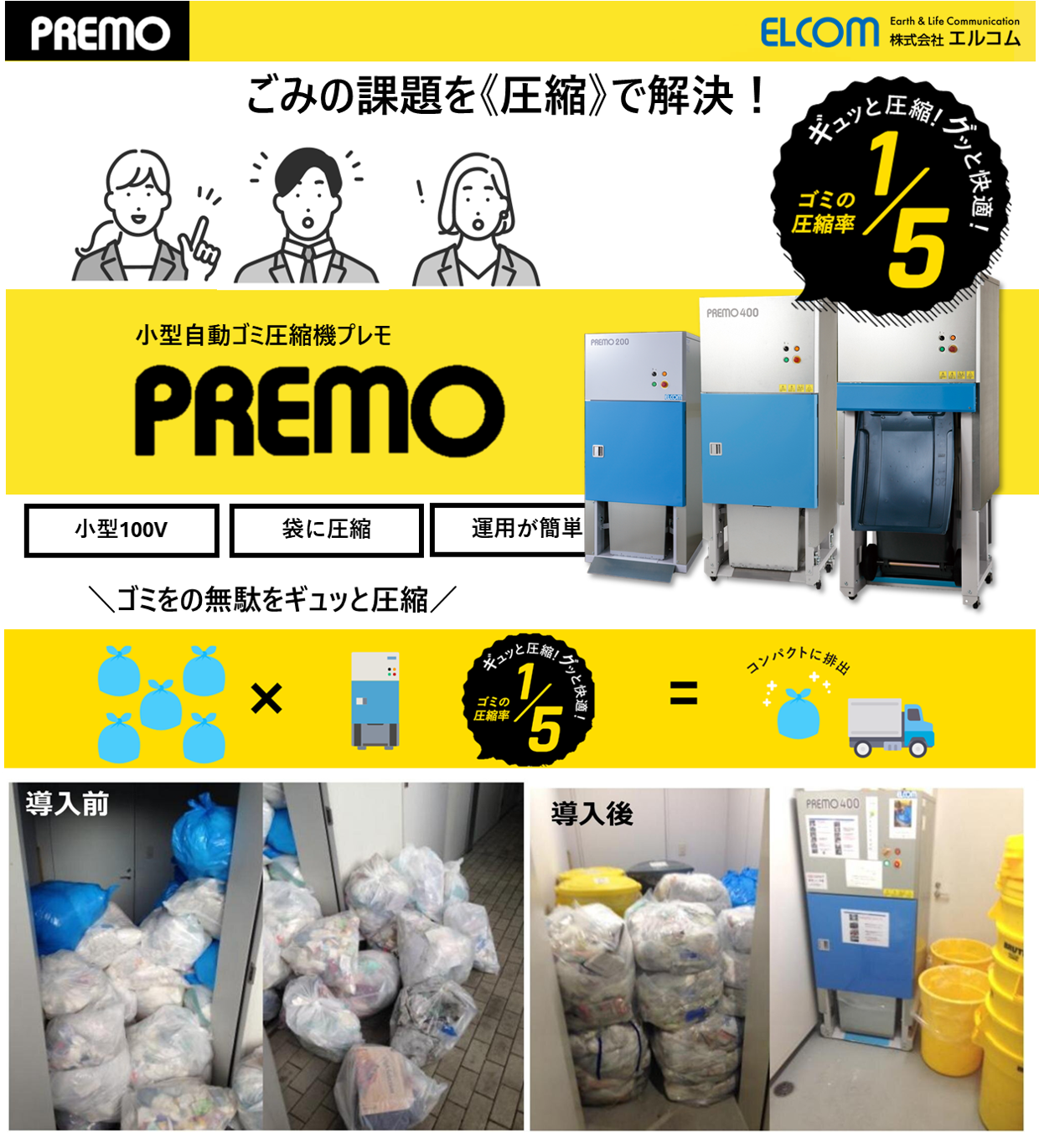ゴミのコンパクト排出ならプレモにお任せ!事業で発生するゴミを圧縮して保管・運搬にかかる様々なコストを削減。ゴミ庫の省スペースや衛生管理にも最適です。