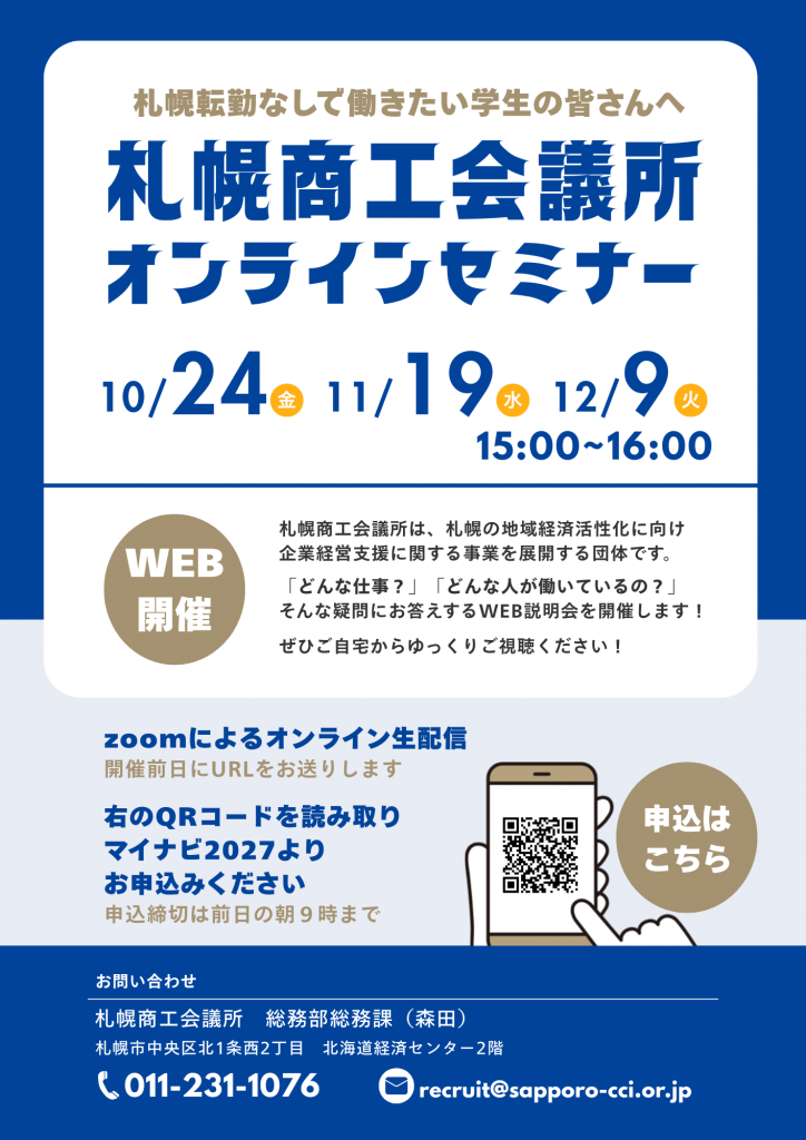 札幌商工会議所は、札幌の地域経済活性化に向け企業経営支援に関する事業を展開する団体です。「どんな仕事?」「どんな人が働いているの?」そんな疑問にお答えする説明会をweb生配信します!